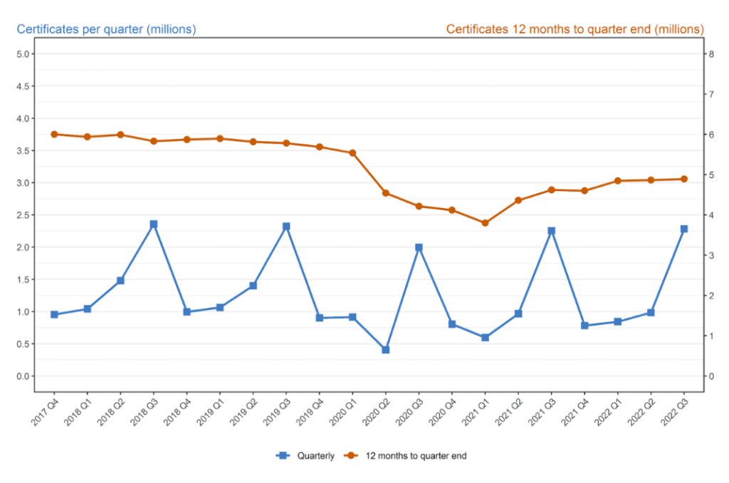 Since 2017, the number of certificates awarded for vocational qualifications has declined, predictably reaching a low point during the Covid-19 lockdown(s). In late 2022, there was an upturn in certification but the numbers are yet to rebound to the same level as in 2017. The Education Committee report highlights that there must be a longer timeline for evaluating the effectiveness of T levels in “preparing students for progression, meeting industry needs and promoting social mobility” before removing funding to Applied General Qualifications (AGQs).